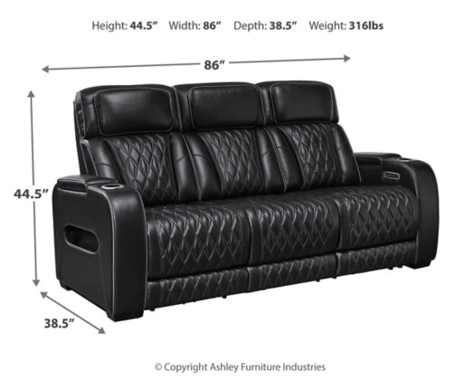 Ready to take your reclining experience to the next level? Then sit up and take notice. With this power reclining sofa, ultimate relaxation is at your fingertips. Experience the pure bliss of an air massage system and heated seats at the touch of a button. The center seat is crafted with a drop-down table with wireless charging and dual cup holders. Plus the luxurious diamond-stitched upholstery is easy on the eyes, adding elegance to any space.