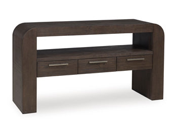 Elevate the everyday with this console table. A rich medium brown finish brings added flexibility, complementing a variety of casual contemporary color schemes. Rounded corners soften the look. Drawers invite miscellaneous storage, while the open shelf encourages you to dress it up with decorative details. Adding chic sofa-side form and function, this console lends an approachably luxe vibe to your space.